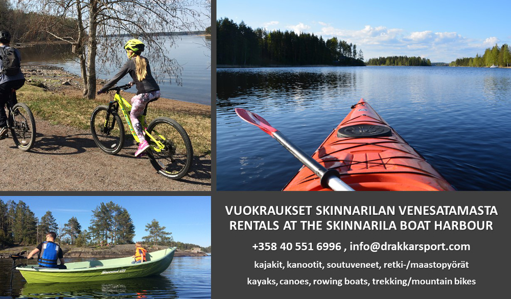 Vuokraamme kalustoa Skinnarilan venesatamasta ennakkovarauksesta. Skinnarilan piste toimii myös keväällä ja syksyllä, kun Hiekkalinnan vuokrauspiste on suljettu. Soittele tai laita viestiä, niin sovitaan yksityiskohdat. Skinnarilasta löytyy niin pyöriä, kajakkeja, kanootteja kuin myös SUP-lautoja. Saatavilla myös retkeilyvälineitä: teltat, makuupussit ja -alustat, retkikeittimet.