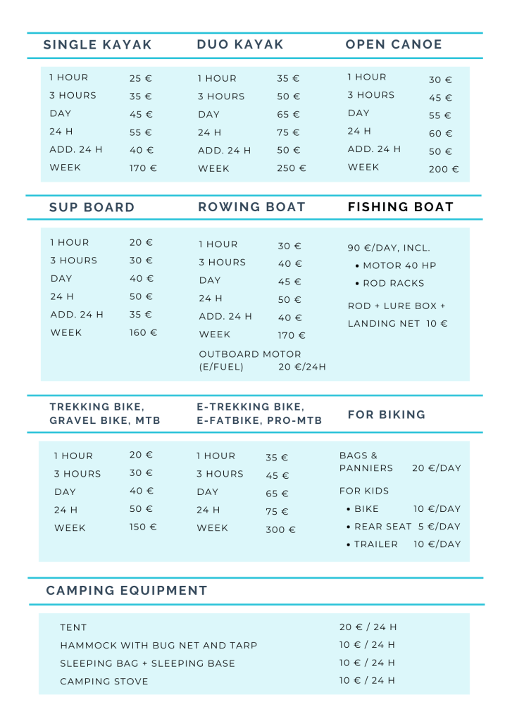 Our rental price always includes accessories such as biking helmets, life jackets, paddles, spray decks and maps (dog life jacket: 5 €). For longer rentals and larger product sets, prices are negotiable.
