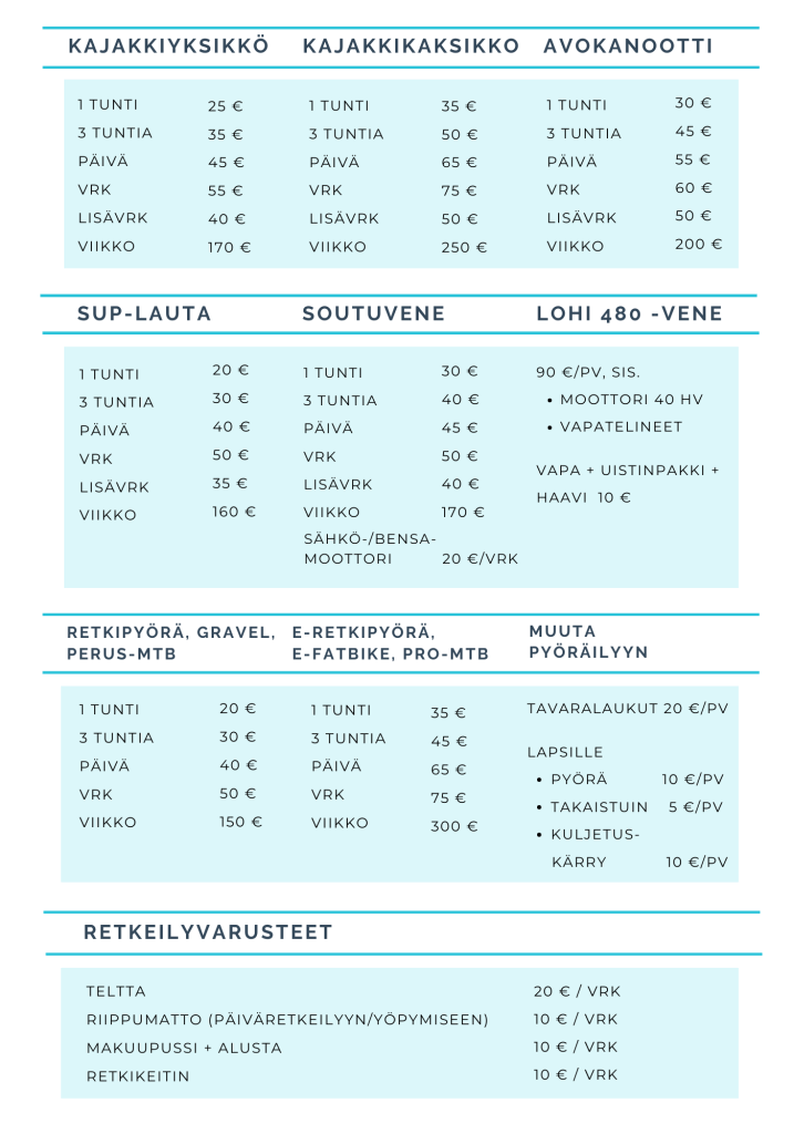 Vuokrahintamme sisältävät aina oheisvarusteet kuten pyöräilykypärät, pelastusliivit, melat, aukkopeitteet ja kartat, (koiran pelastusliivit: 5 €). Pidemmissä vuokrauksissa ja isommissa tuotekokonaisuuksissa hinnat neuvoteltavissa.